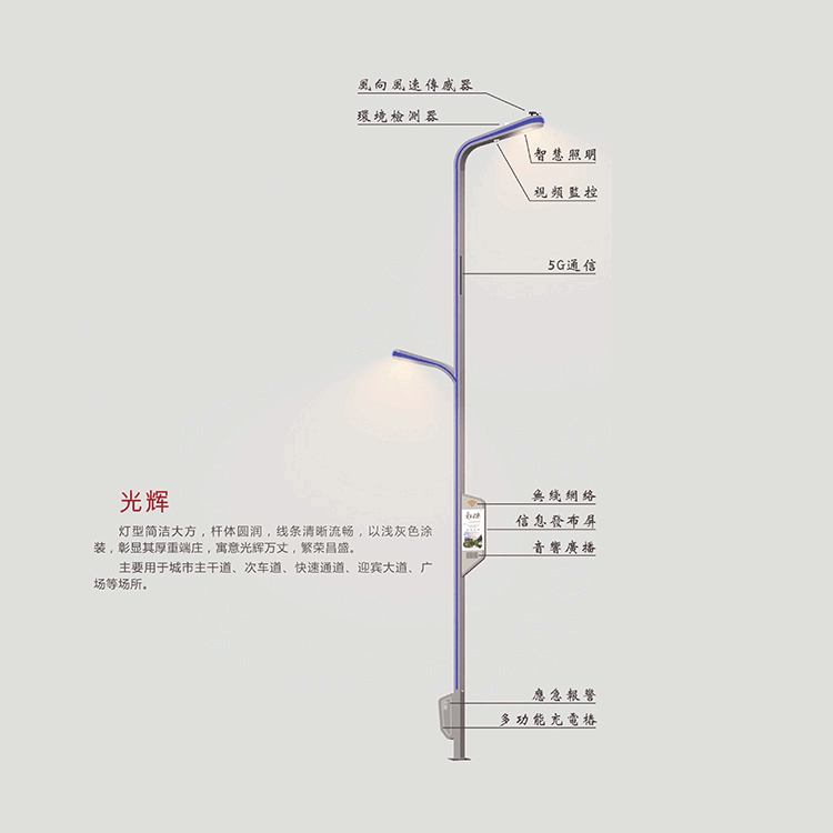 智慧路燈是以道路功能照明為主,利用路燈桿為載體,在燈桿上安裝電動(dòng)車充電、為手機(jī)連上WiFi、監(jiān)控道路信息、環(huán)境監(jiān)測(cè)PM2.5、顯示屏信息發(fā)布、無(wú)線上網(wǎng)、視屏監(jiān)控、應(yīng)急呼救、4G/5G微基站等多種功能,實(shí)現(xiàn)資源共享、節(jié)省資源,提升公共照明管理水平,節(jié)省維護(hù)成本。這么說(shuō)的話,大家還是會(huì)有點(diǎn)不明白可以看下圖片,大家可以了解一下